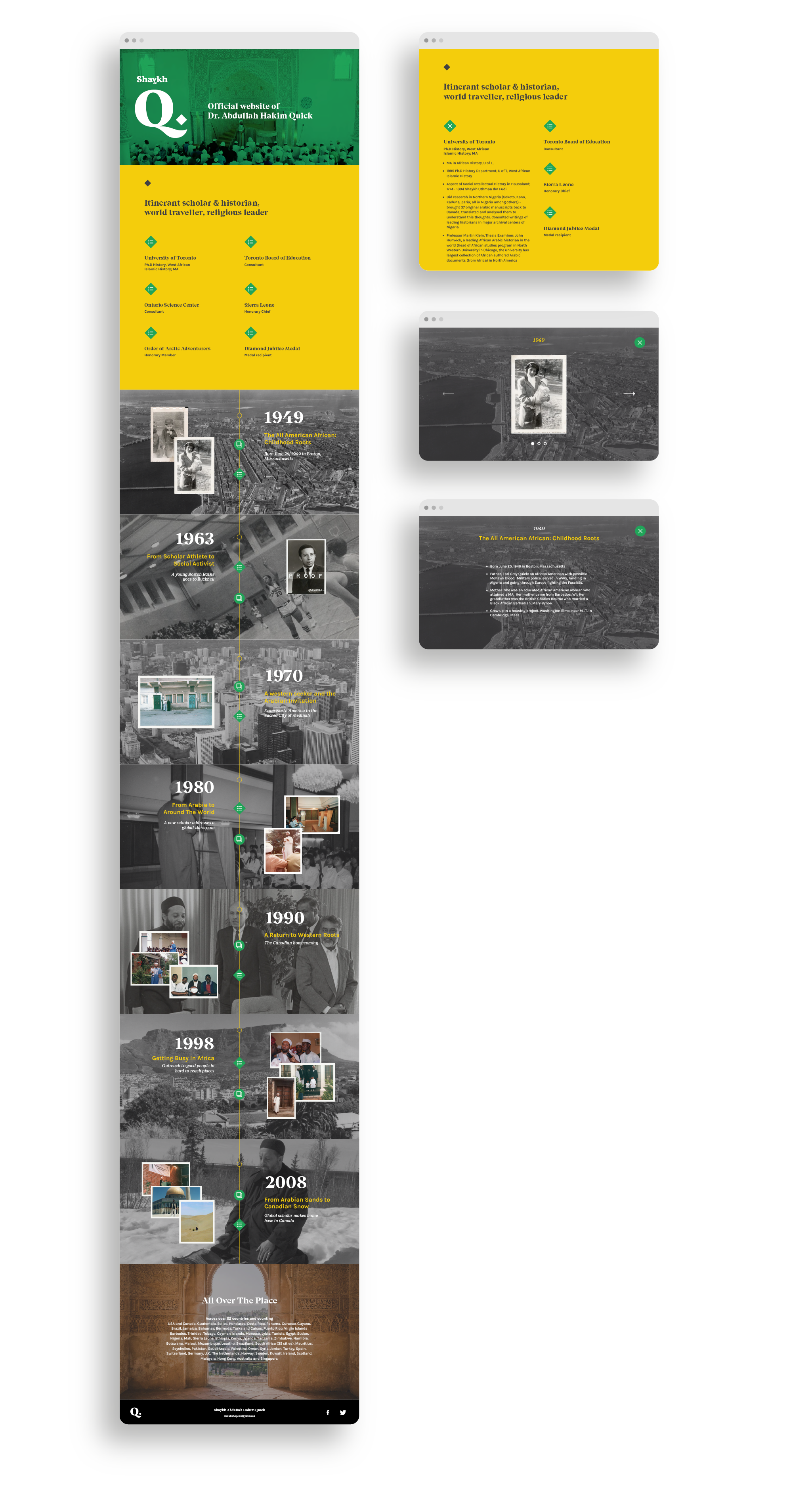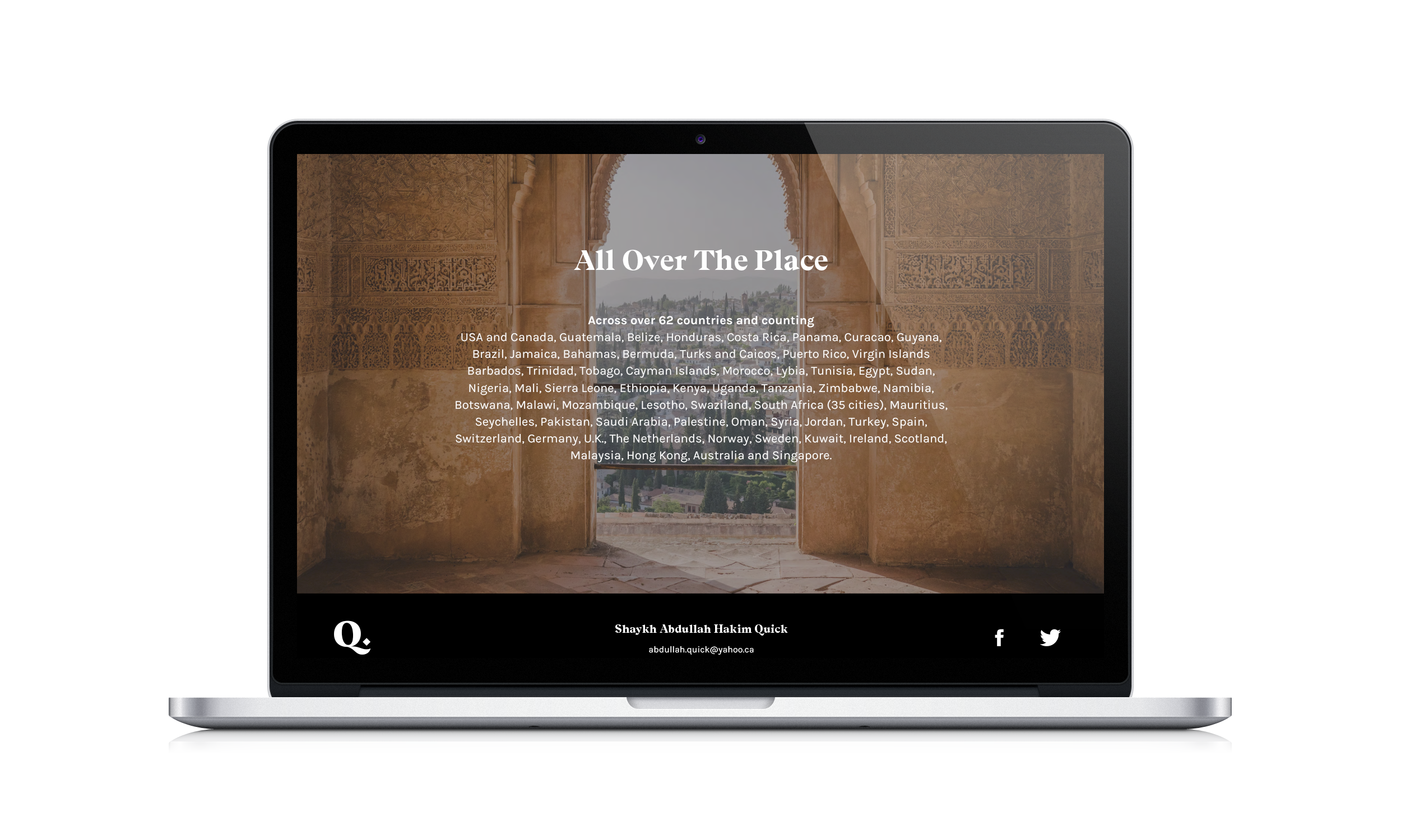 Dr Q is a web design project for Dr. Abdullah Hakim Quick, who is a well known Islamic scholar and lecturer. Dr. Quick traveled around the world to give lectures at universities, mosques and at public events. This landing page is designed to present the historic events and stories through out his life.