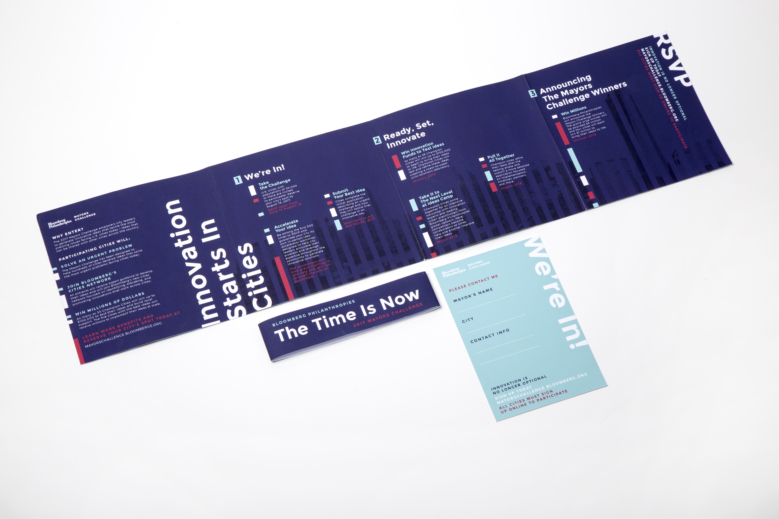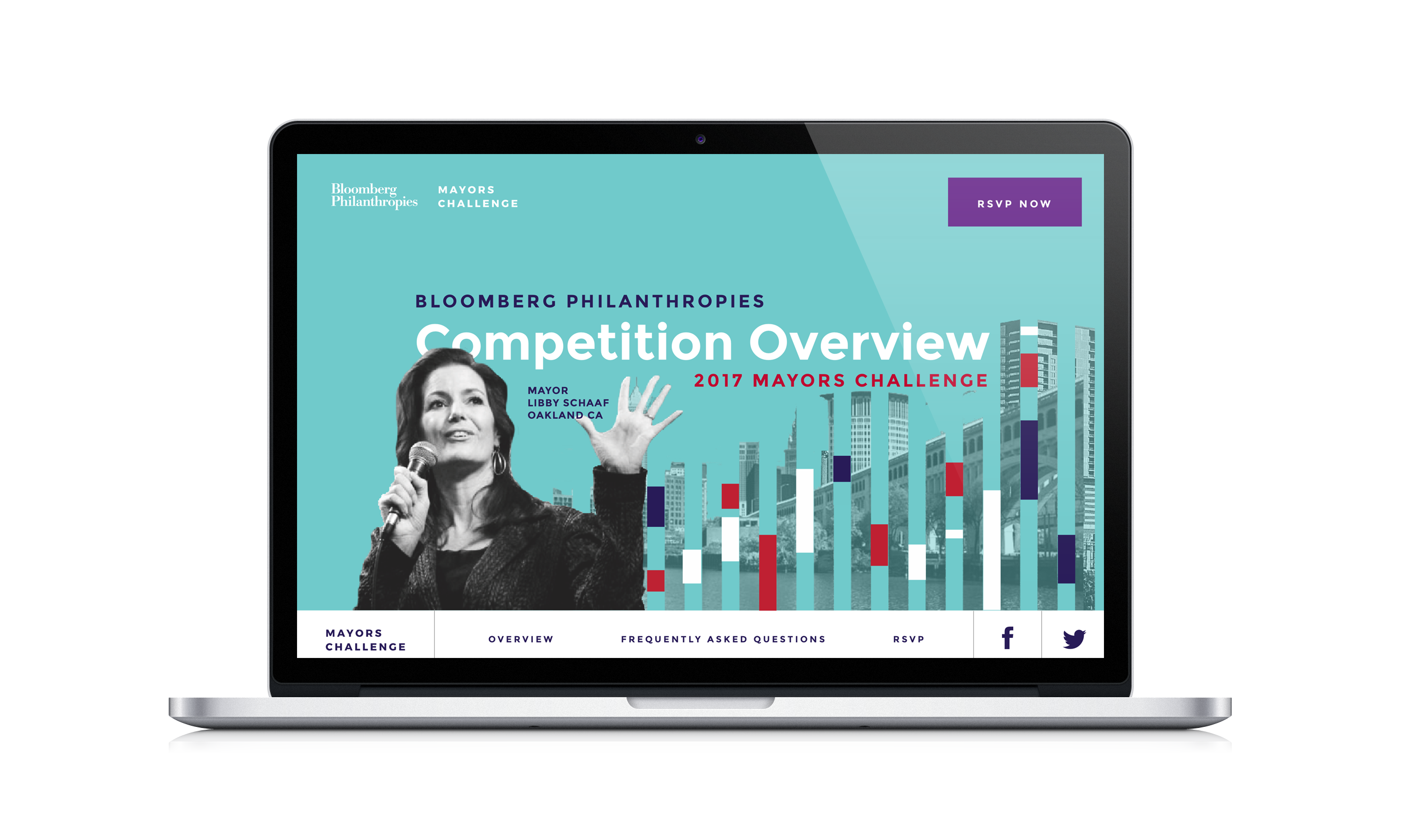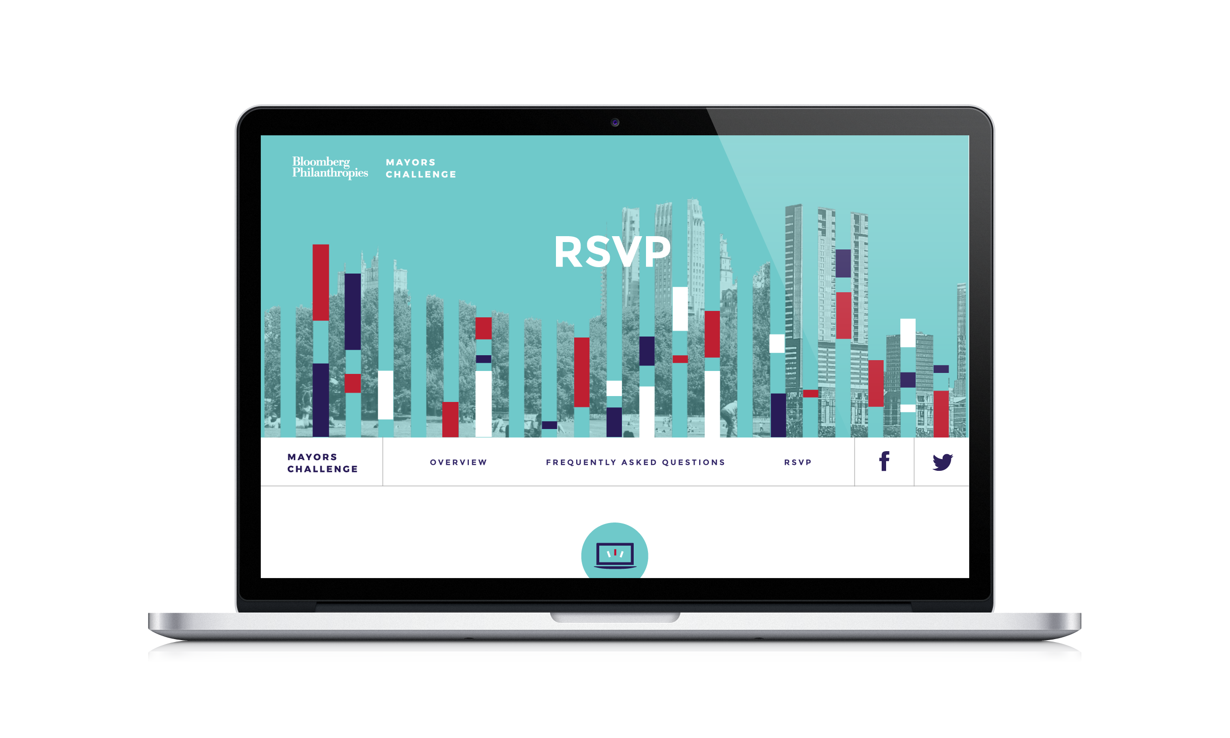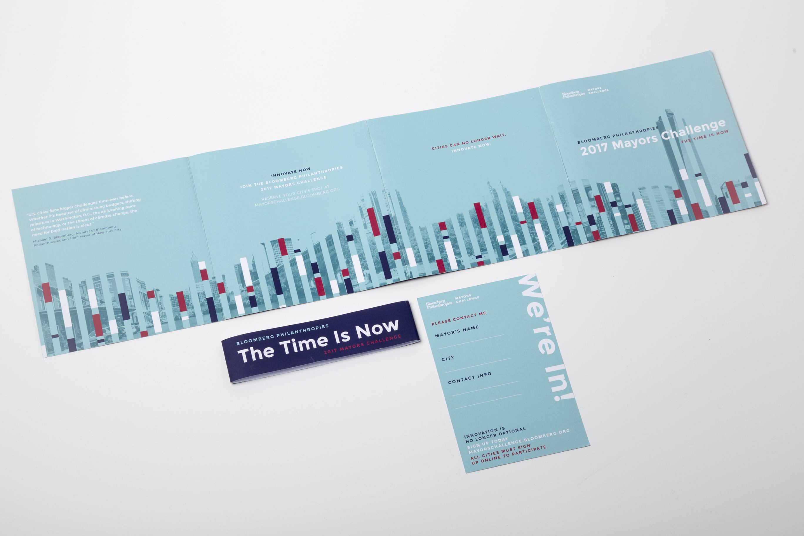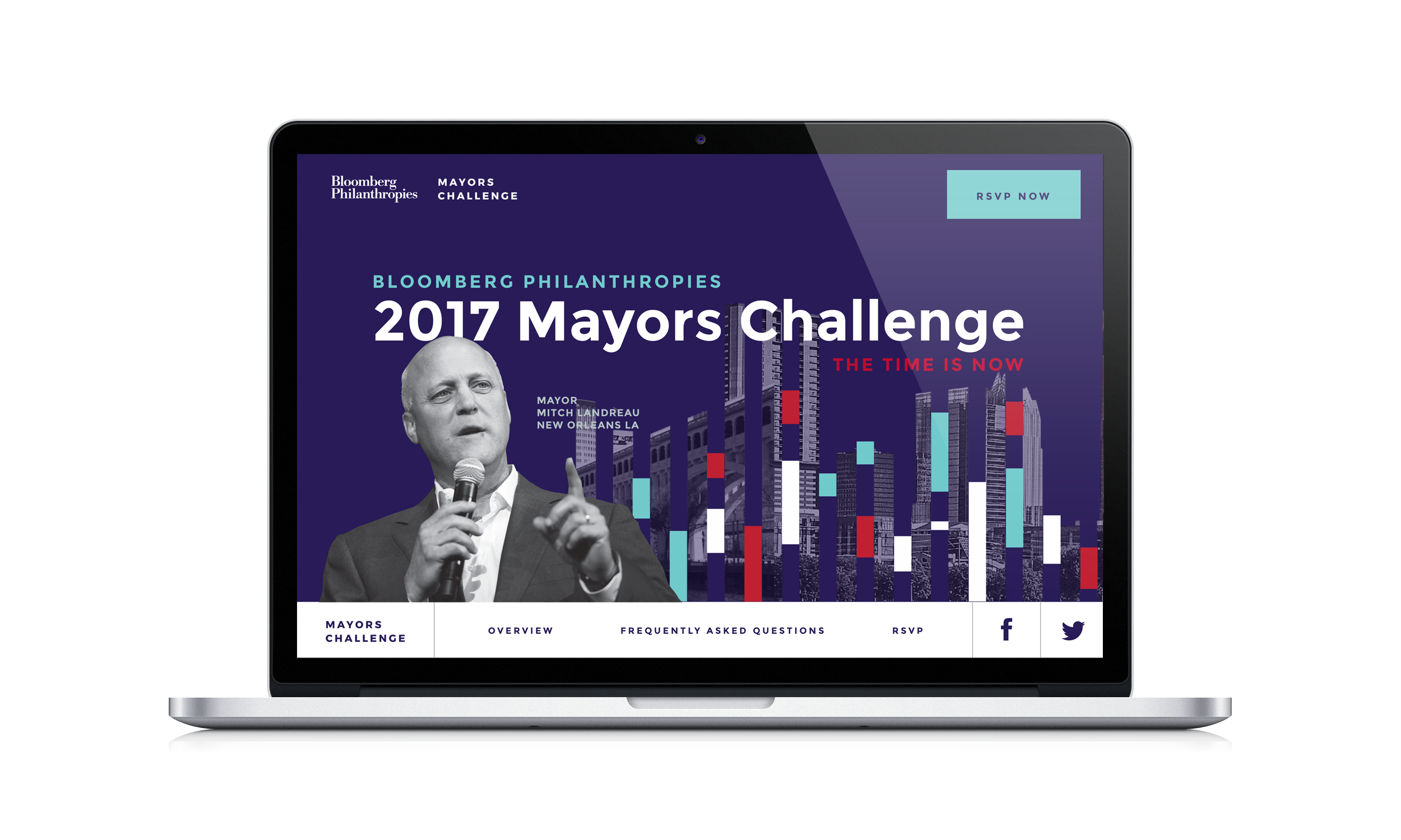 The 2017 Mayors Challenge is taking place in the United States. With the notion of "urgency" and "change", calling out for mayors who are willing to participate, innovate, and to bring their cities to a newer level. Using a modernized color palette of the America, we also incorparate the iconic skyline from the previous years, but give it a more abstract and futuristic style. Visual elements are also being used throughout all event pieces and the upcoming program assets.