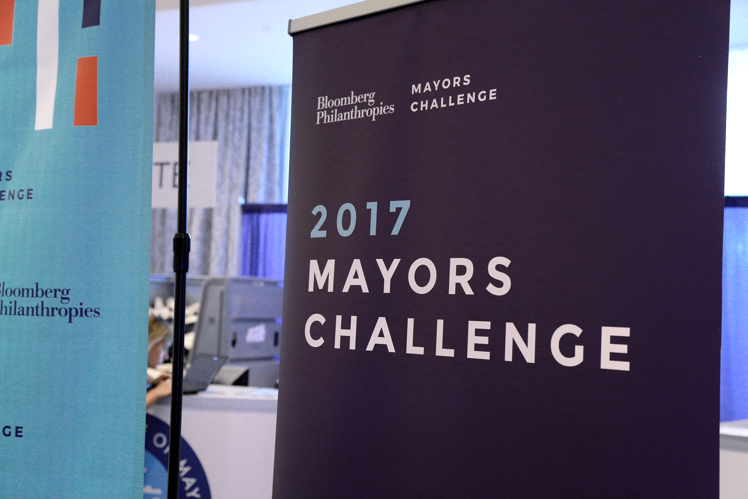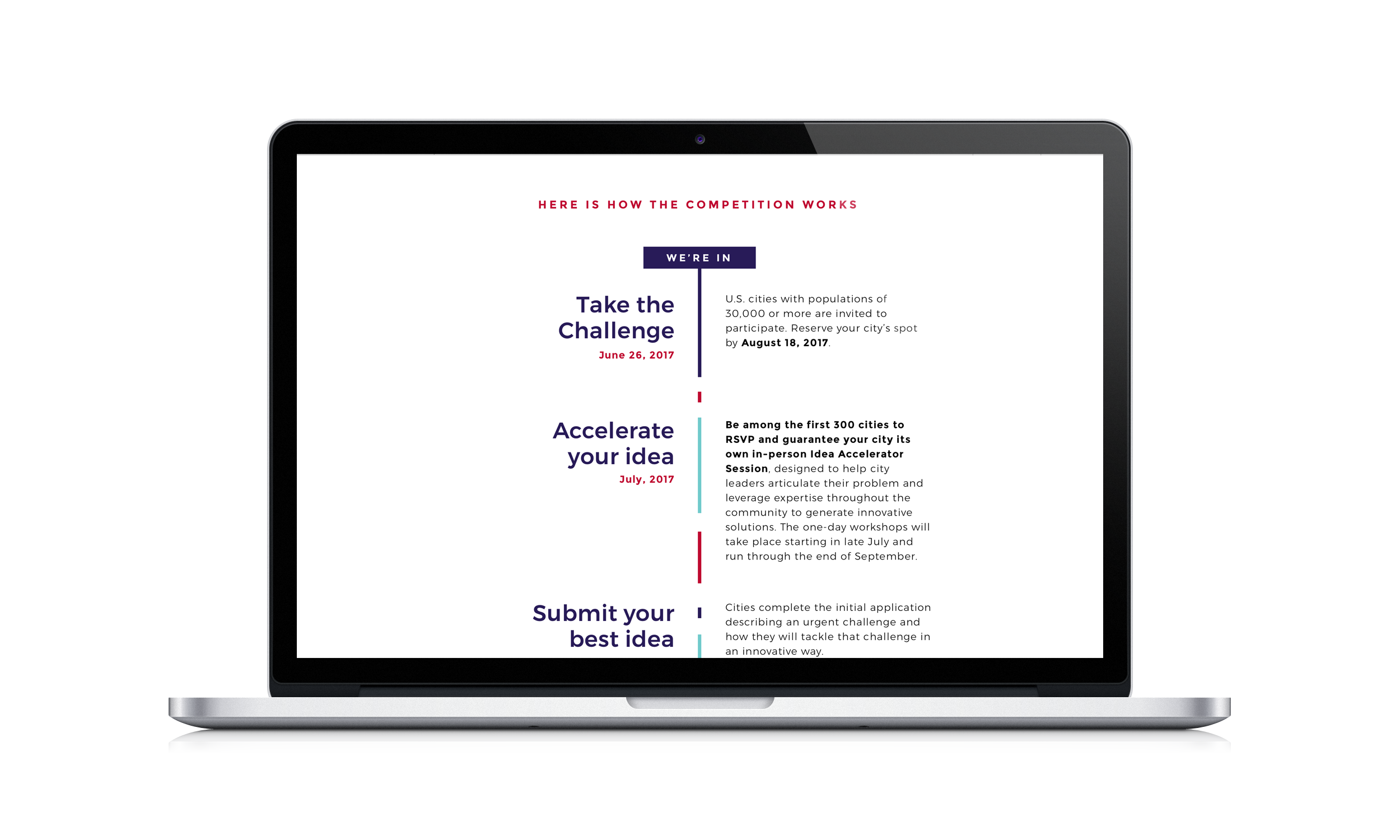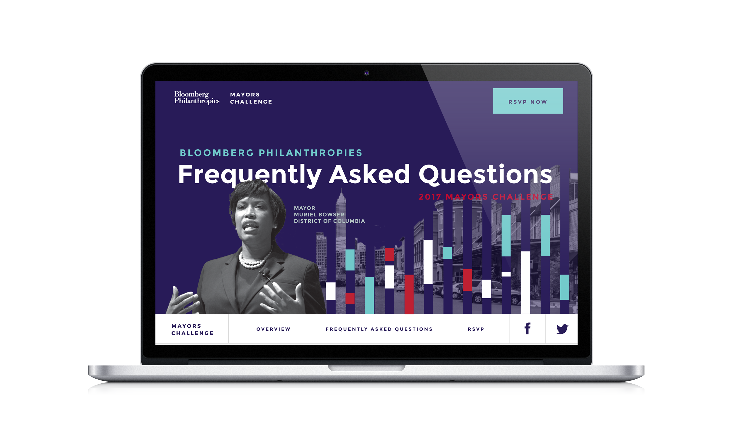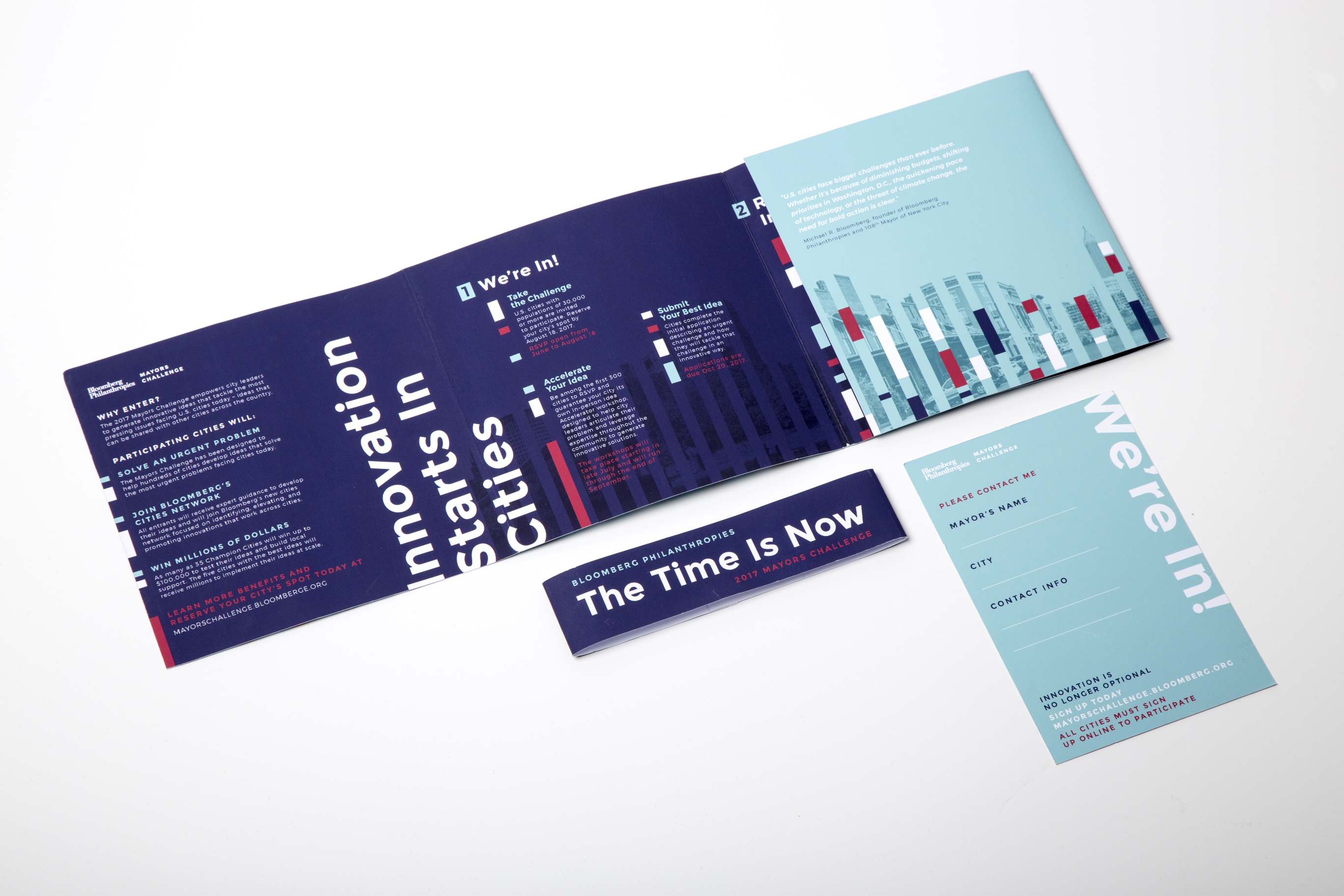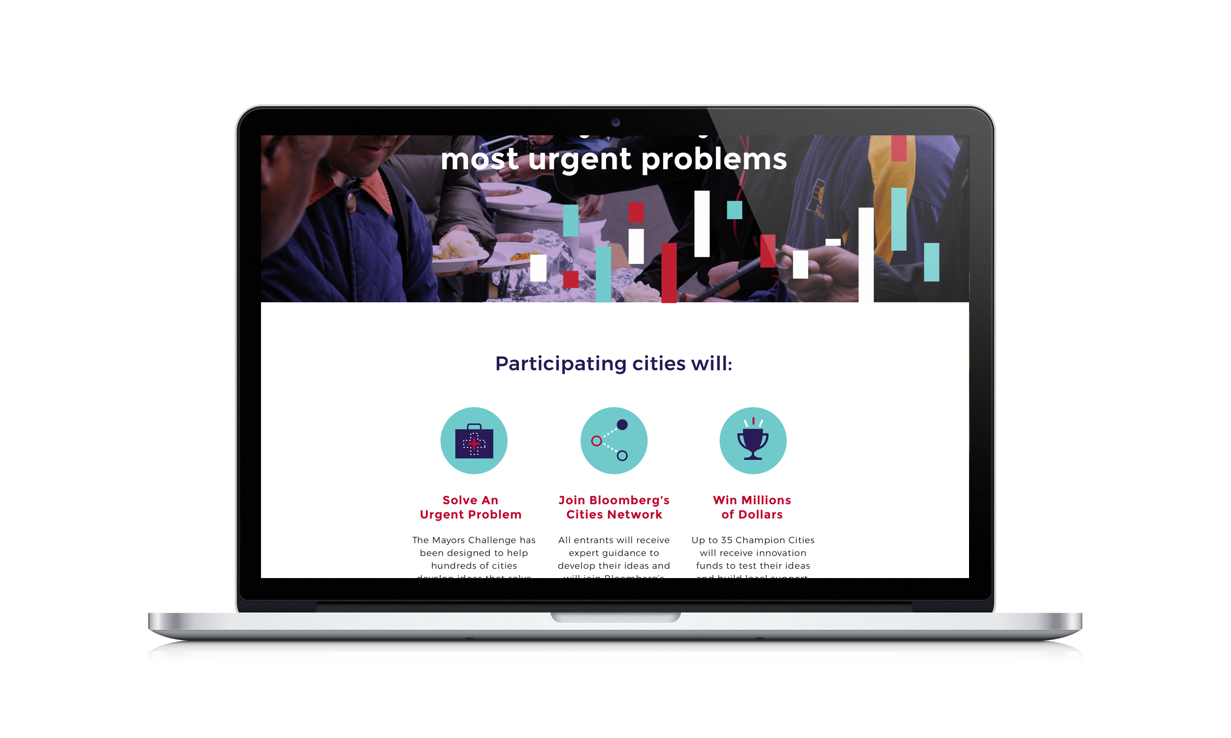 The 2017 Mayors Challenge is taking place in the United States. With the notion of "urgency" and "change", calling out for mayors who are willing to participate, innovate, and to bring their cities to a newer level. Using a modernized color palette of the America, we also incorparate the iconic skyline from the previous years, but give it a more abstract and futuristic style. Visual elements are also being used throughout all event pieces and the upcoming program assets.