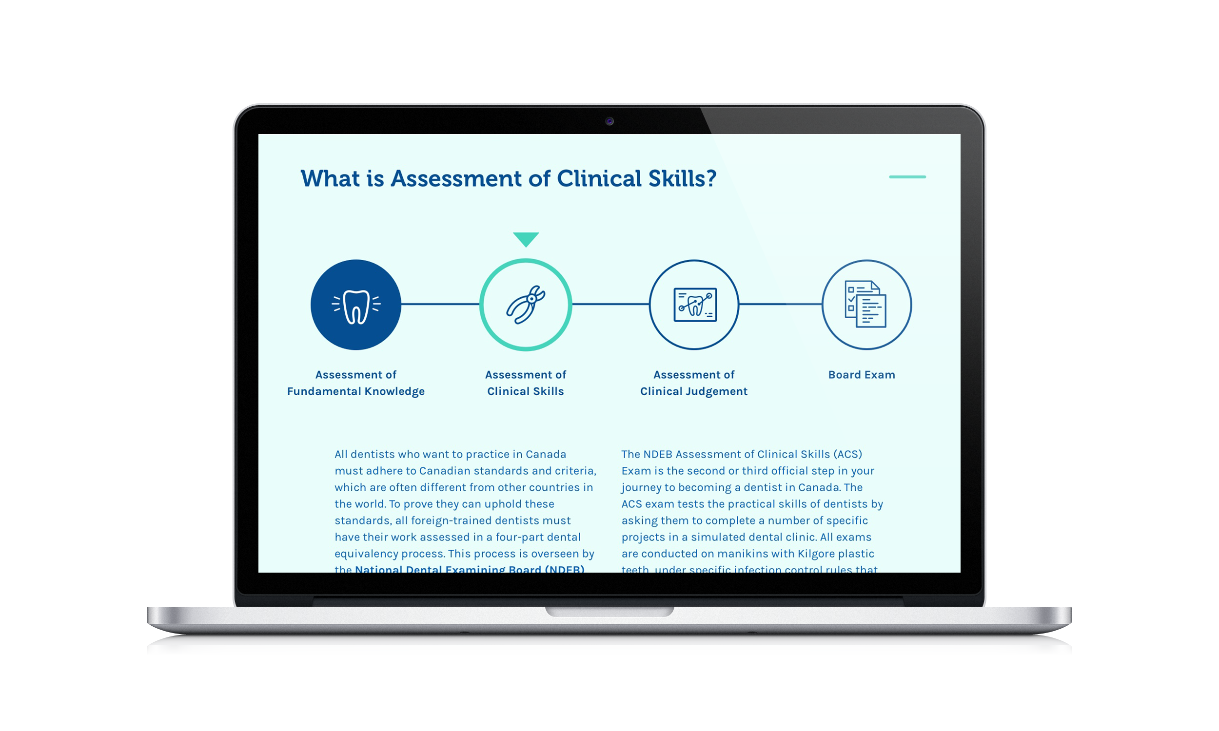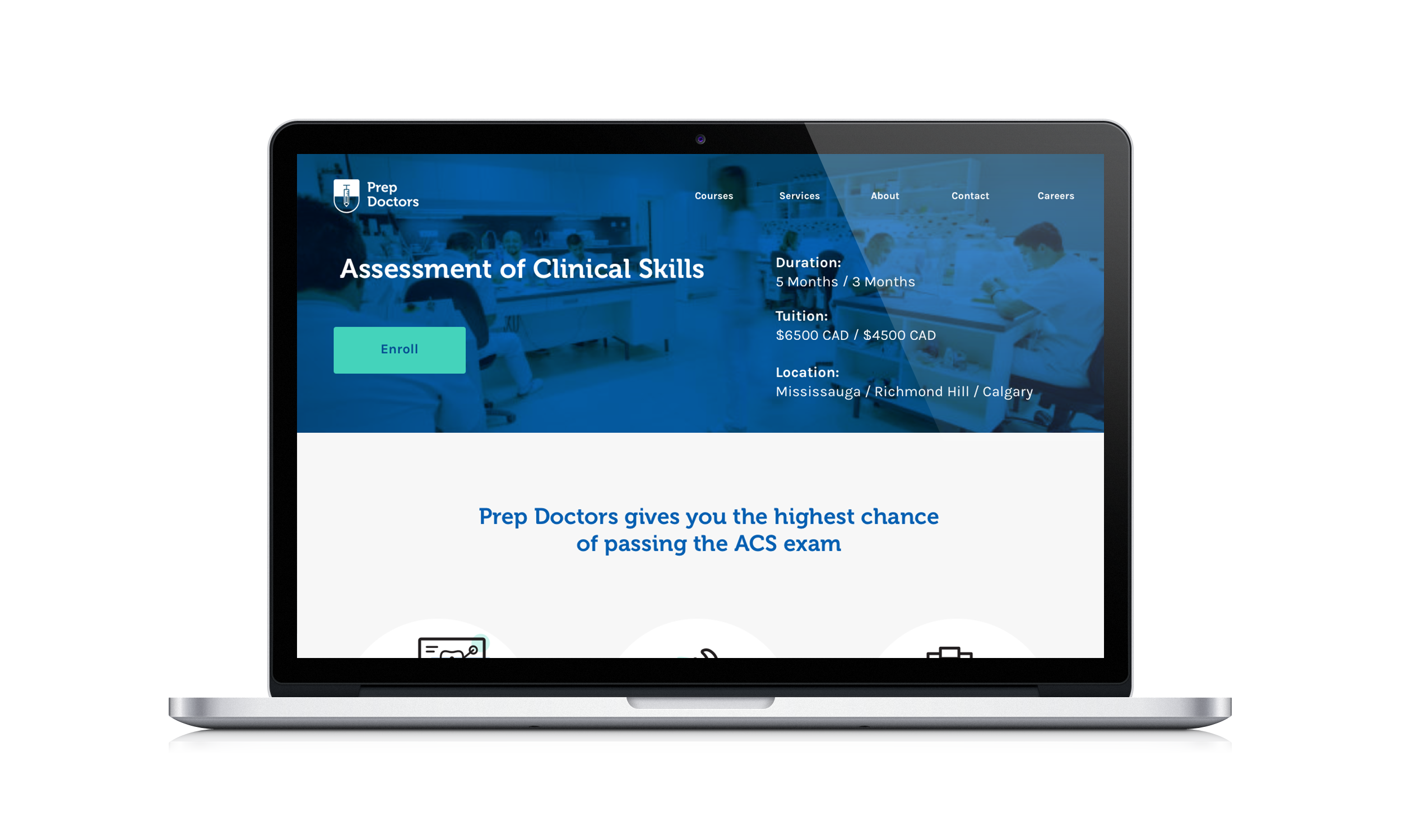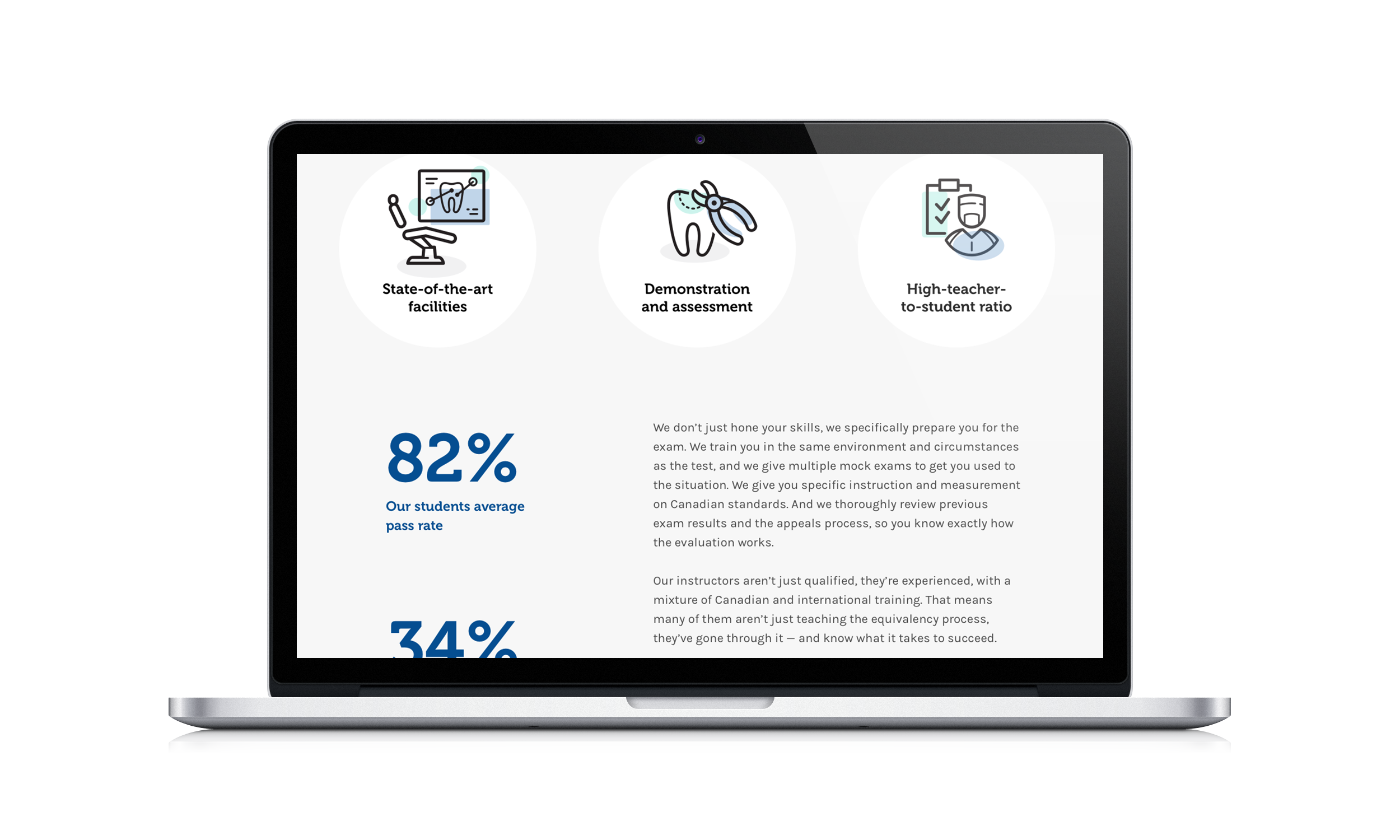 Prep Doctors is a dental training institute that prepares international dentists to obtain Canadian equivalency and begin practicing in Canada. When taking on this project, the initial brand has been established with some basic elements such as logo, icons, typography and colours, our job was to futher develop the brand, created brand guidelines, and a full functional website